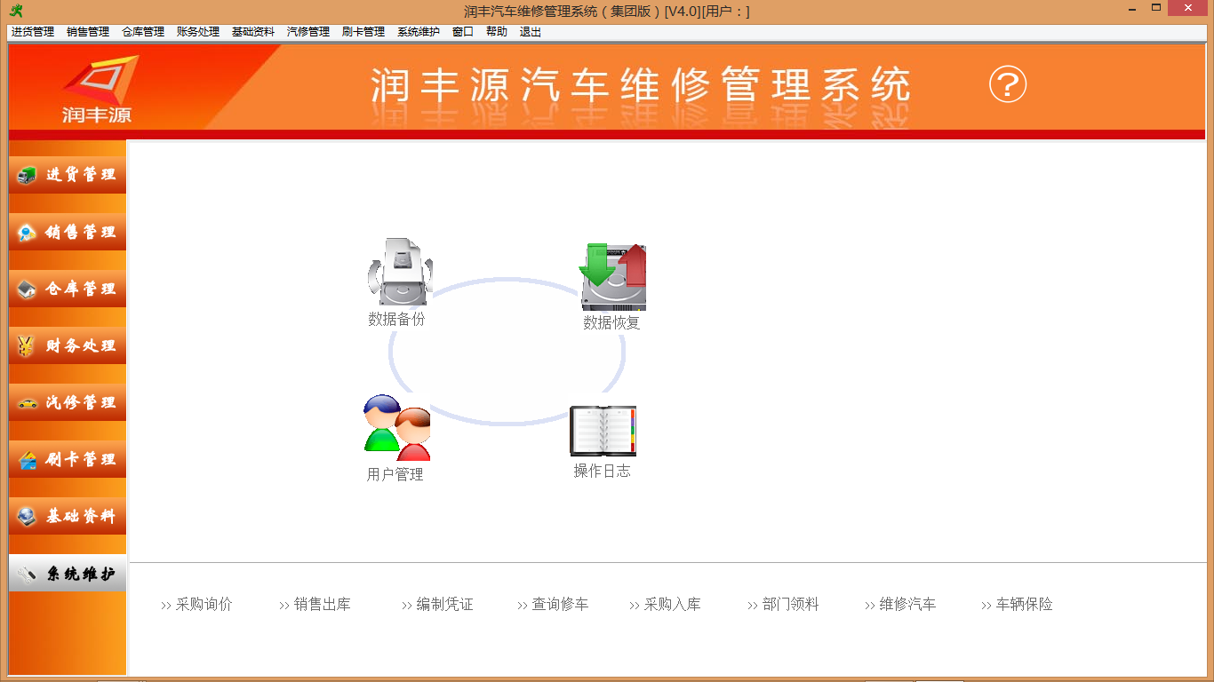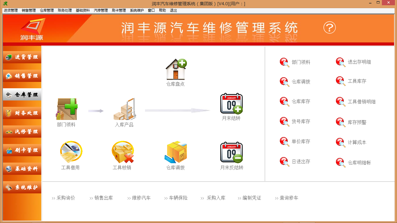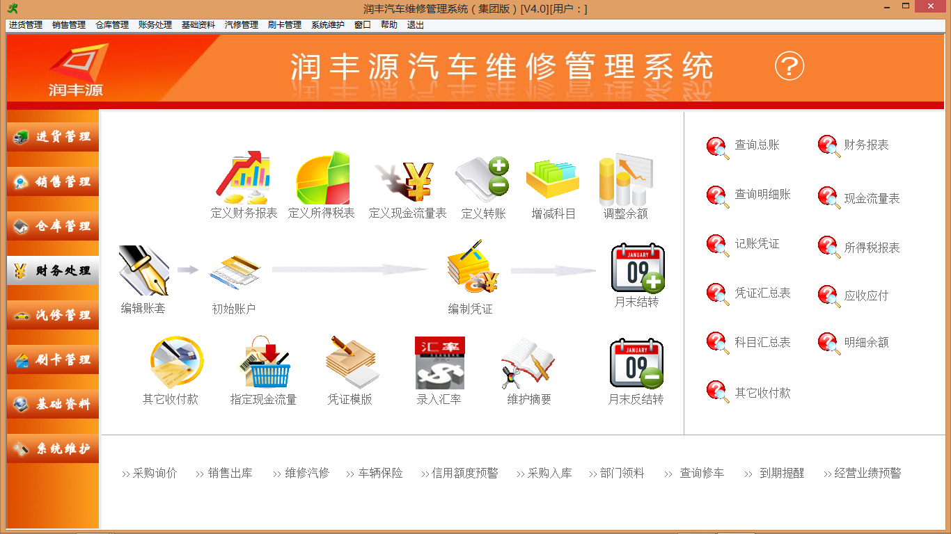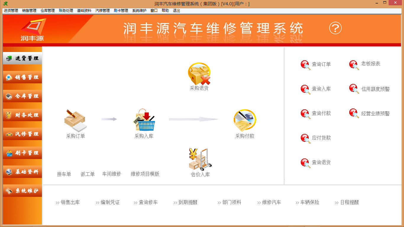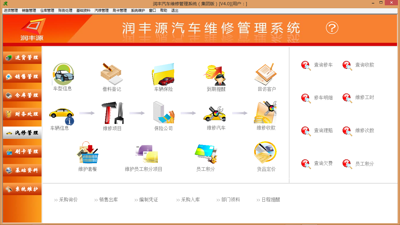 润丰源汽修软件包括进货管理、销售管理、仓库管理、工具管理、汽修管理、车辆保险、客户回访、会员管理、账务核算、老板报表、基础资料、系统维护等功能模块,实现了业务与财务的一体化管理,清楚地核算到公司每笔的收入、支出情况。可开启自动预警功能,打开本系统,就会自动判断仓库库存、客户和供货商的信用额度、经营业绩、重要信息的到期提醒等预警,及时提醒您需要处理的重要事项;老板报表,让老总及时、全面、直观地了解公司仓库货品、维修业绩、资金状况等提供了可能;本系统操作简便,界面直观,业务数据可直接生成记账凭证,自动生成总账、明细账、科目汇总表和财务报表等。