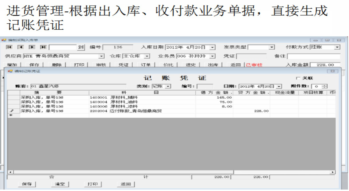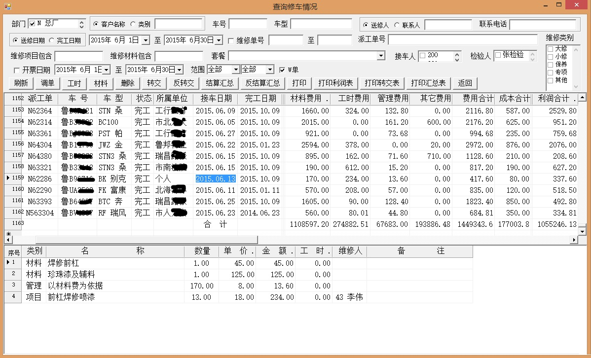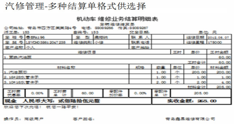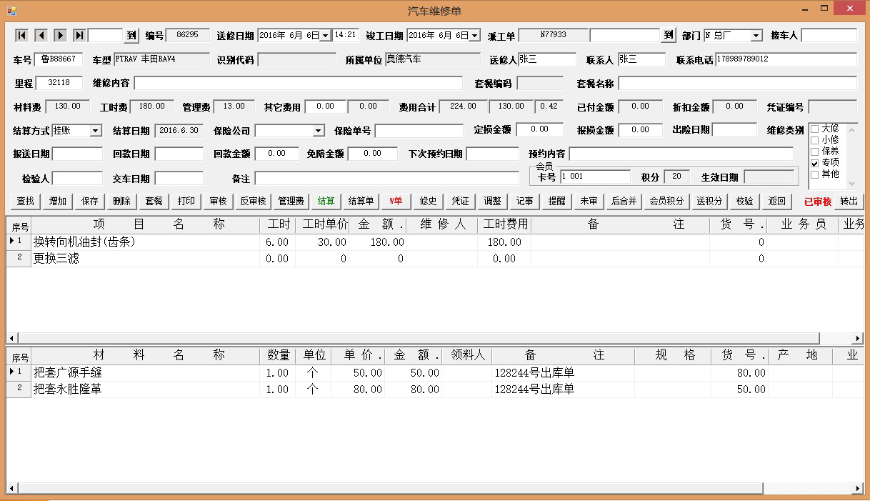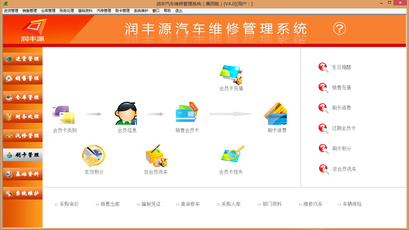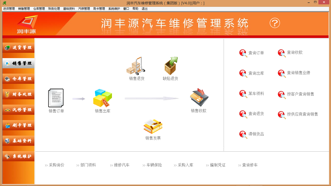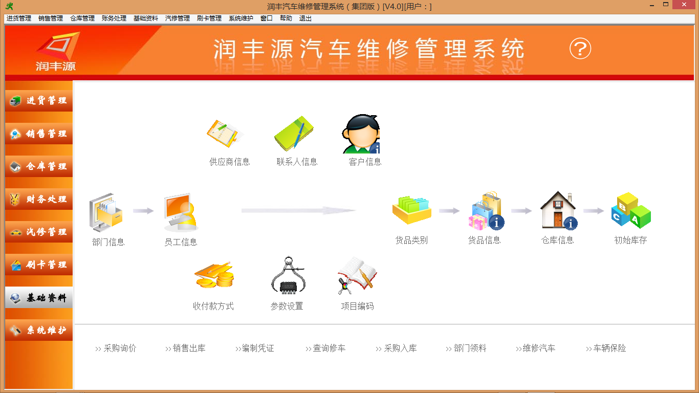 润丰源汽修软件包括进货管理、销售管理、仓库管理、工具管理、汽修管理、车辆保险、客户回访、会员管理、账务核算、老板报表、基础资料、系统维护等功能模块,实现了业务与财务的一体化管理,清楚地核算到公司每笔的收入、支出情况。可开启自动预警功能,打开本系统,就会自动判断仓库库存、客户和供货商的信用额度、经营业绩、重要信息的到期提醒等预警,及时提醒您需要处理的重要事项;老板报表,让老总及时、全面、直观地了解公司仓库货品、维修业绩、资金状况等提供了可能;本系统操作简便,界面直观,业务数据可直接生成记账凭证,自动生成总账、明细账、科目汇总表和财务报表等。